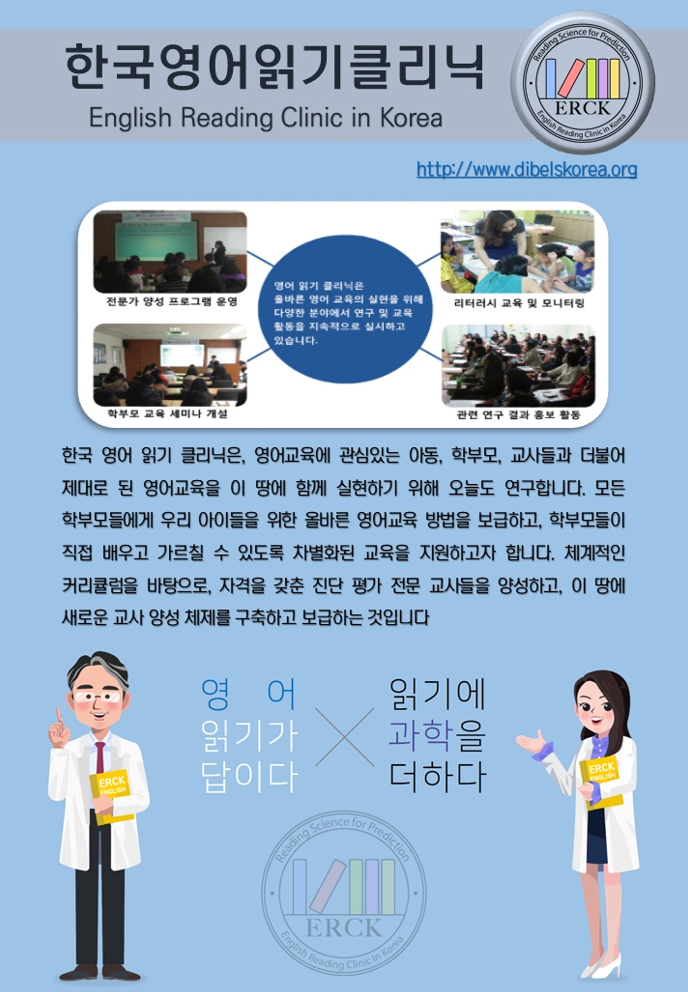 2008년 설립 된 한국영어읽기클리닉(English Reading Clinic in Korea)은 미국 오레건 대학교 읽기클리닉센터( University of Oregon Reading Clinic Center)와 의 지속적인 연구 협력을 바탕으로, 미국 Acadience Reading Ltd. 와 연구 협약을 쳬결 하고, 한국형 읽기진단프로그램의 공동 연구 개발과 현장 확산을 목적으로 설립되었습니다.